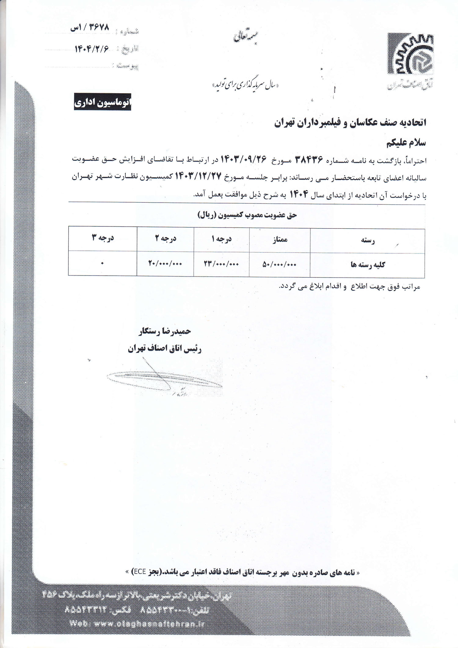طبق بخشنامه 1/3678 س اتاق اصناف مورخه 1403/12/27 حق عضویت کلیه رسته های صنفی اتحادیه عکاسان وفیلمبرداران تهران برای سال 1404 طبق جدول اعلامی بشرح ذیل است.