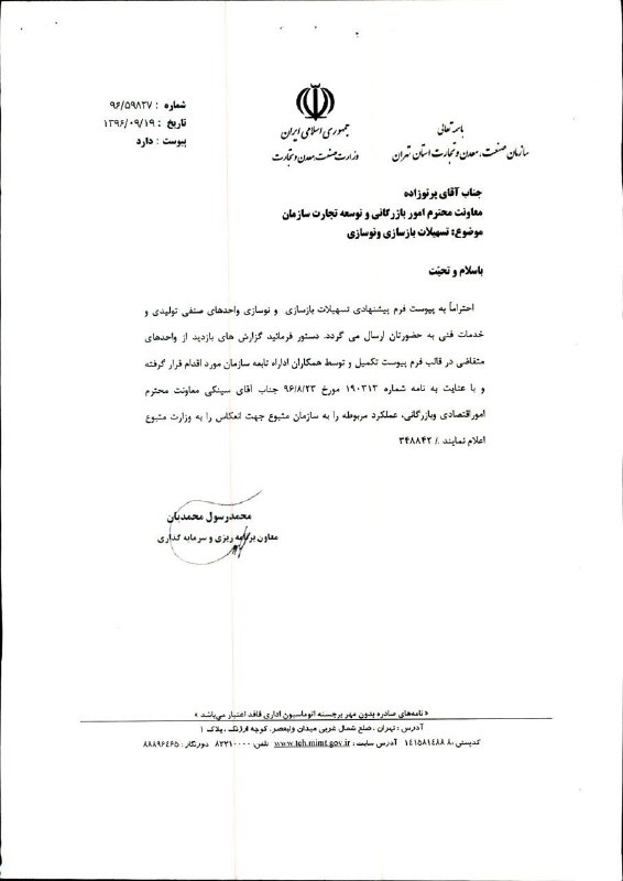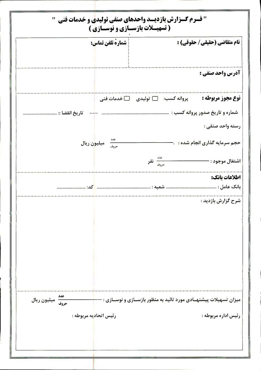 احتراما " برابر اعلام اتاق اصناف تهران ، بمنظور بازسازی و نو سازی واحد های صنفی( تولیدی و خدمات فنی) ، تسهیلاتی در دستور کار وزارت صنعت ، معدن و تجارت قرار گرفته است، لذا همکارانی که تمایل دارند جهت دریافت تسهیلات بازسازی و نو سازی اقدام نمایند ، طبق بخشنامه مذکور با تکمیل پرسشنامه ( فرم گزارش بازدید واحدهای صنفی تولیدی و خدمات فنی) که در ذیل این اطلاعیه درج شده است به دفتر اتحادیه مراجعه نمایند.